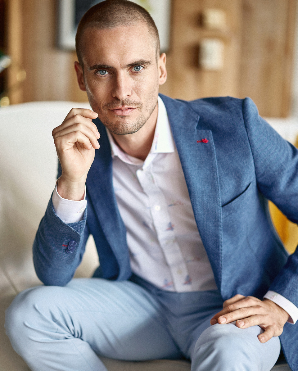 Ce look Vicomte A. incarne un équilibre subtil entre élégance estivale et décontraction maîtrisée. Le blazer ajusté en lin bleu Capri, pièce forte de cette silhouette, se marie parfaitement au pantalon comfort fit bleu Provençal, créant une harmonie de teintes lumineuses et modernes.