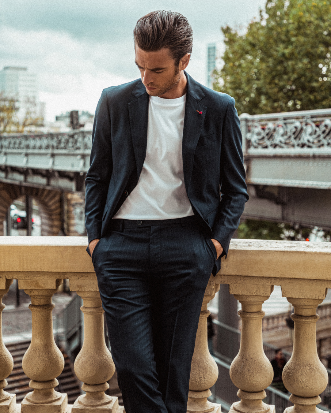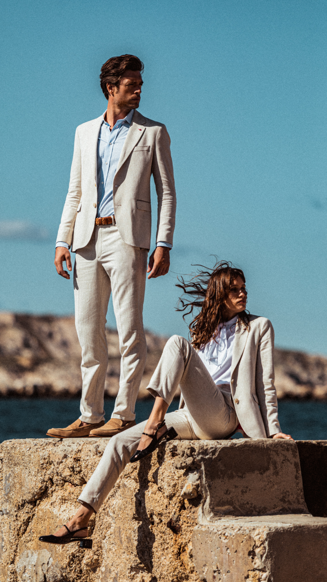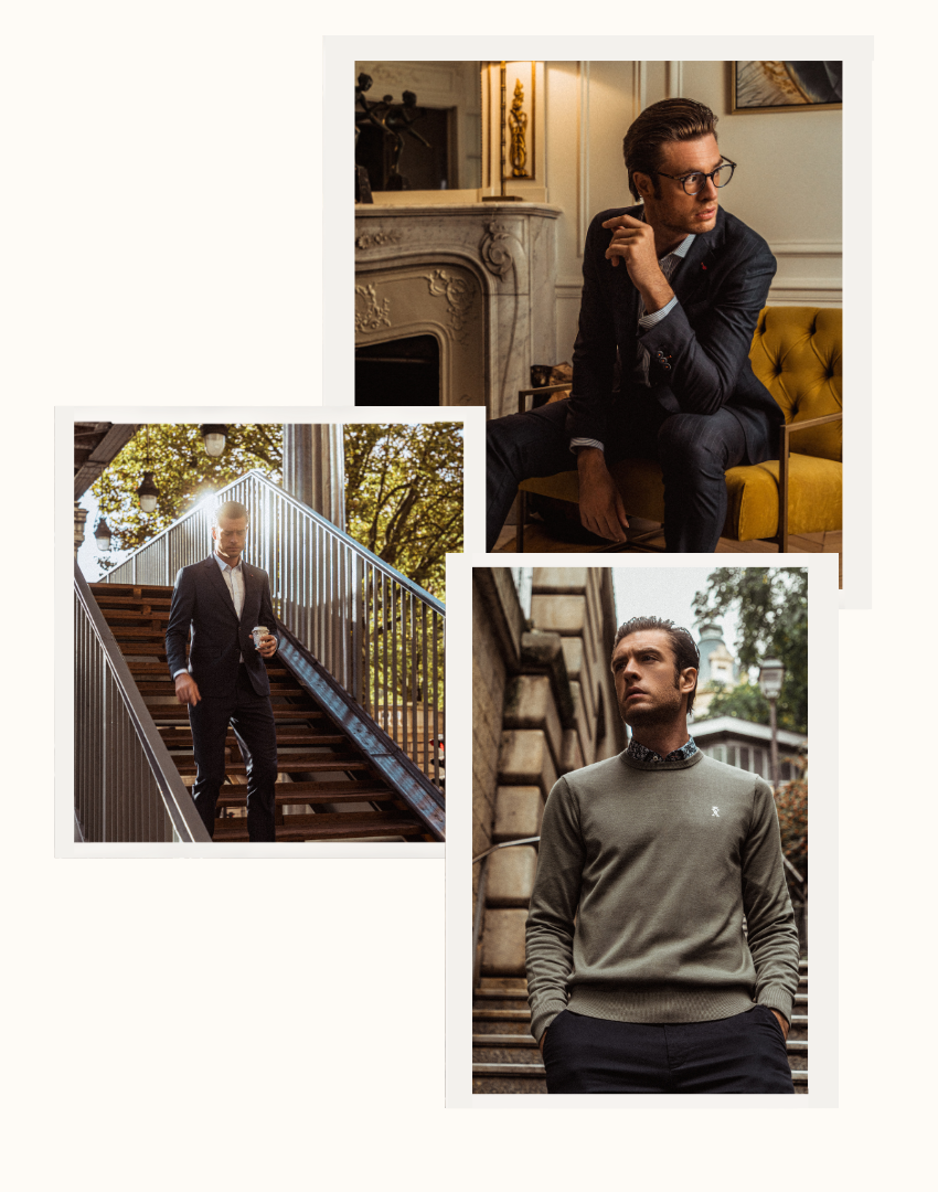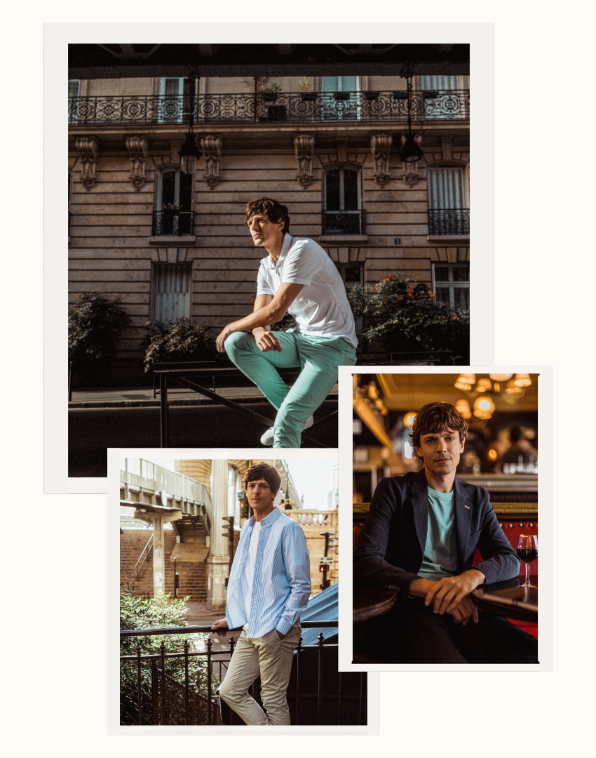 De l’autre, le temps s’étire. Les lignes s’assouplissent, les matières respirent, les couleurs s’expriment. Surchemises ouvertes, polos lumineux, accessoires assumés dessinent une silhouette plus libre, où le style se vit avec naturel. Une élégance maîtrisée, qui laisse place à l’instinct et à la créativité.