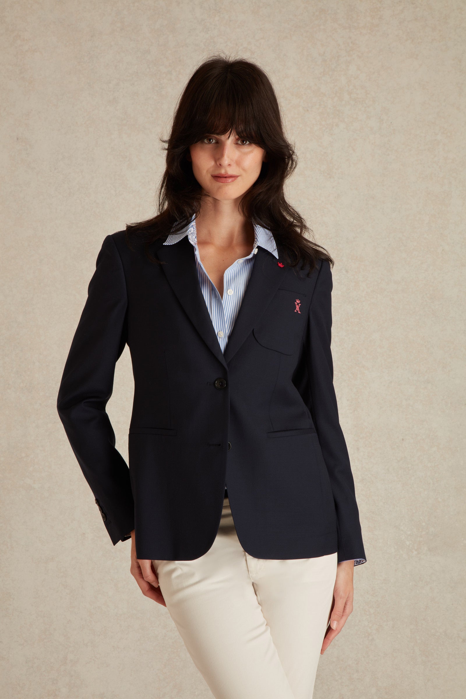 Élégance structurée et allure intemporelle. Le blazer Betina revisite un classique du vestiaire féminin avec une coupe ajustée et une matière en laine hopsack subtilement texturée.
