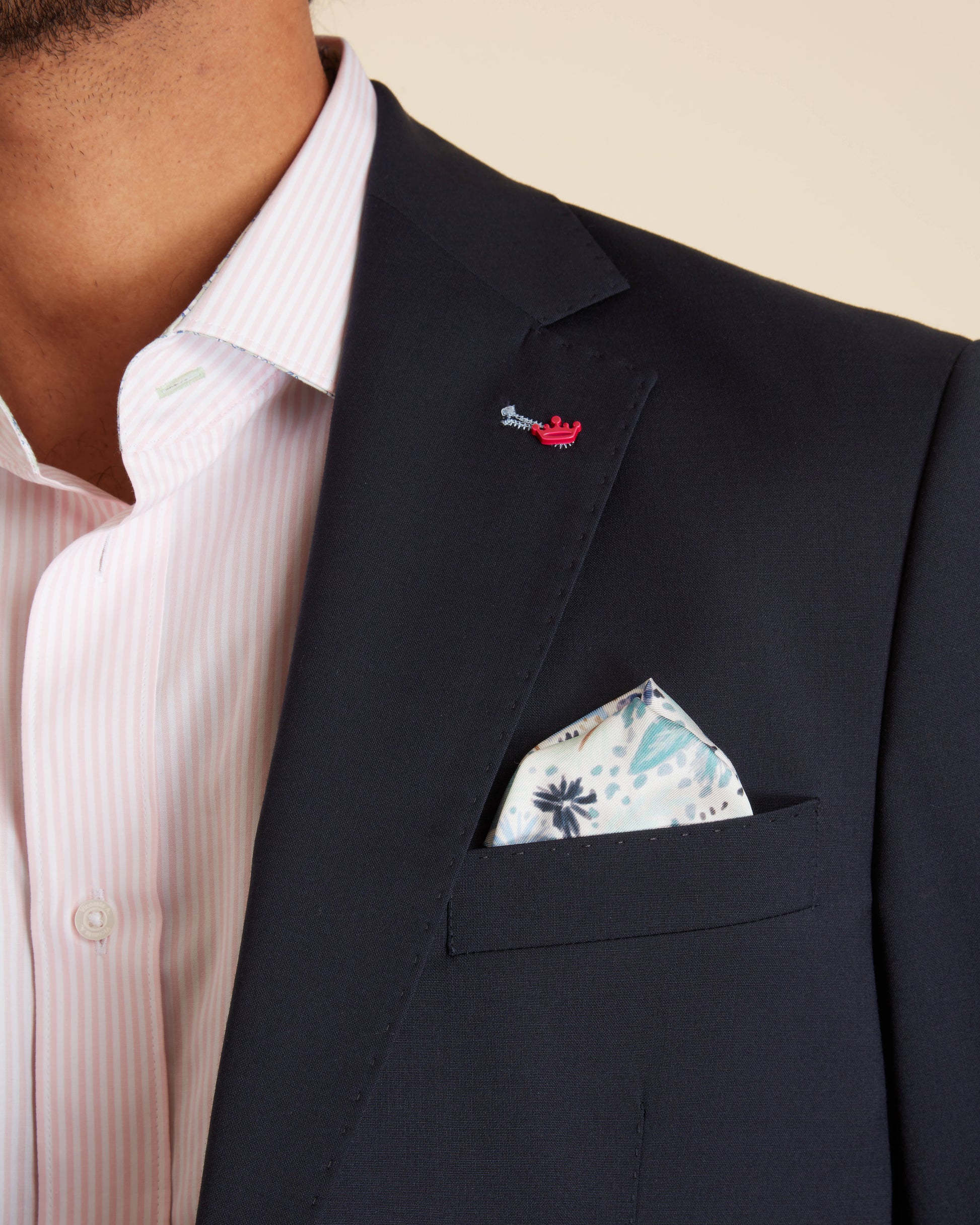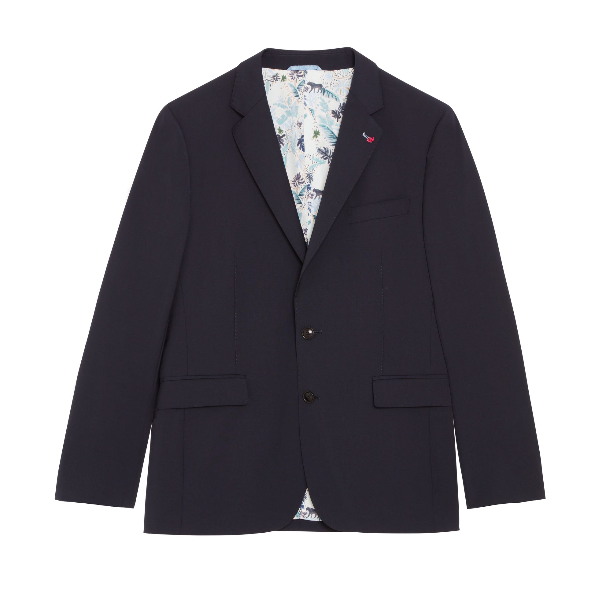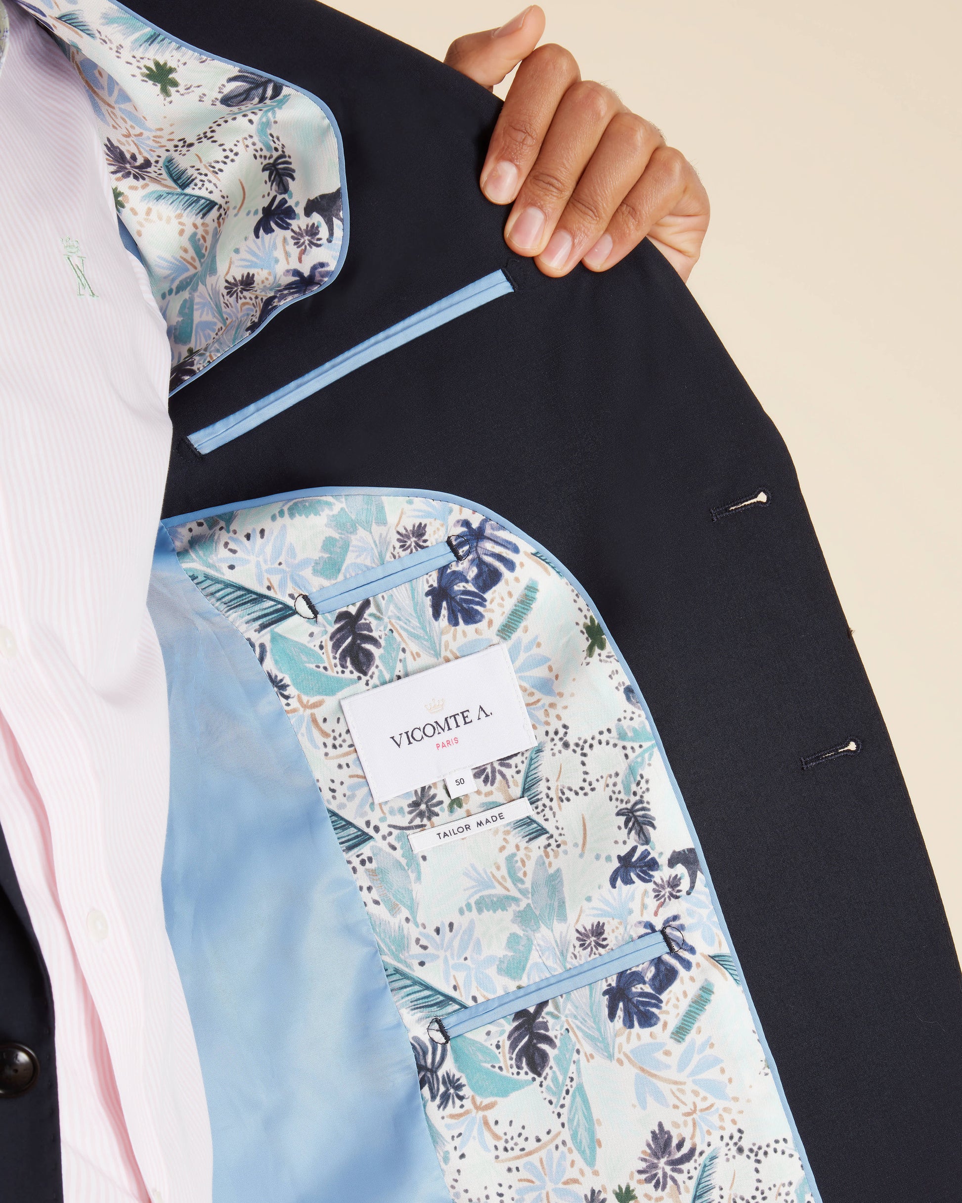 L’intérieur du blazer révèle tout le soin apporté aux détails : une doublure imprimée exclusive Vicomte A., signature de la maison, et des poches passepoilées ornées du même motif, pour une touche discrète mais raffinée.