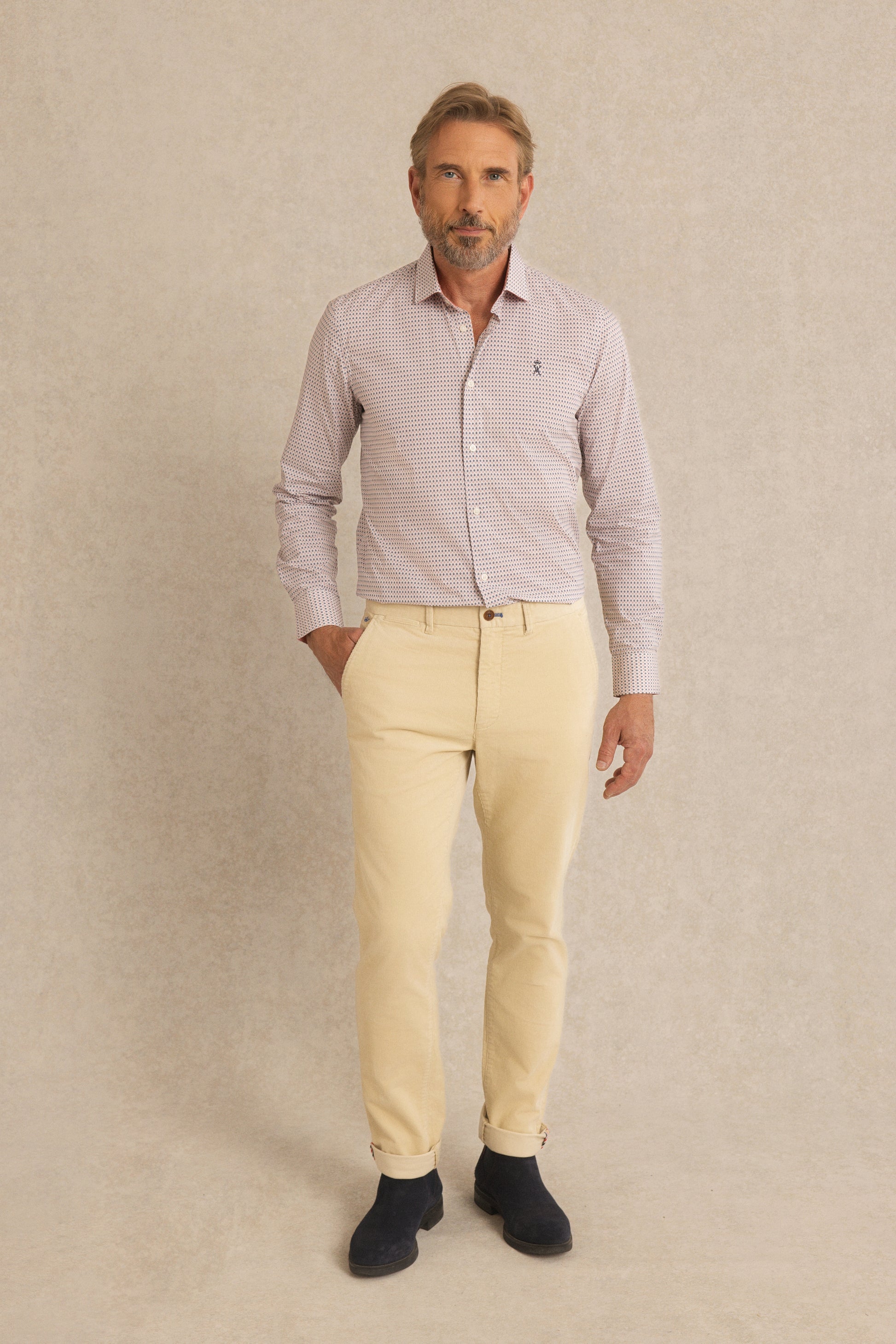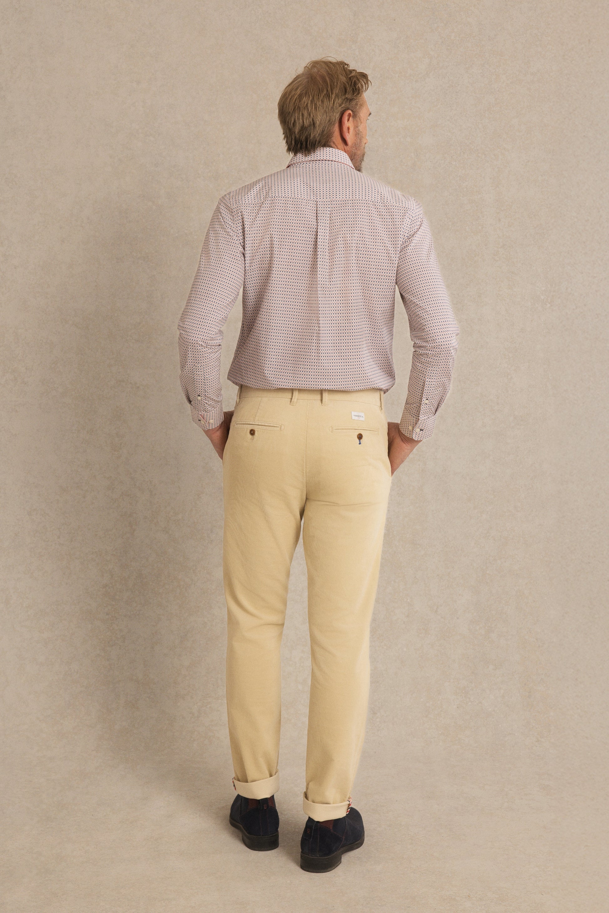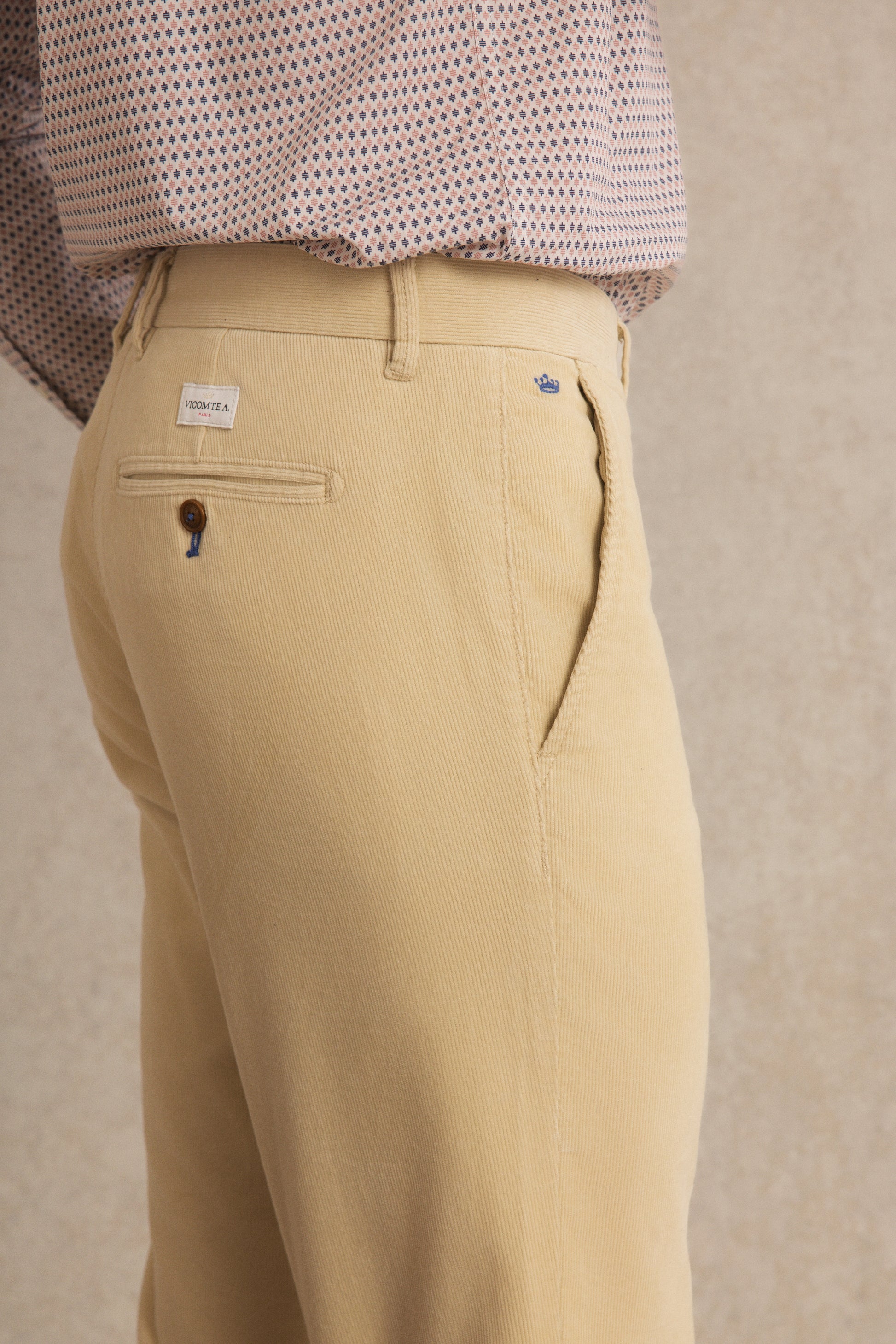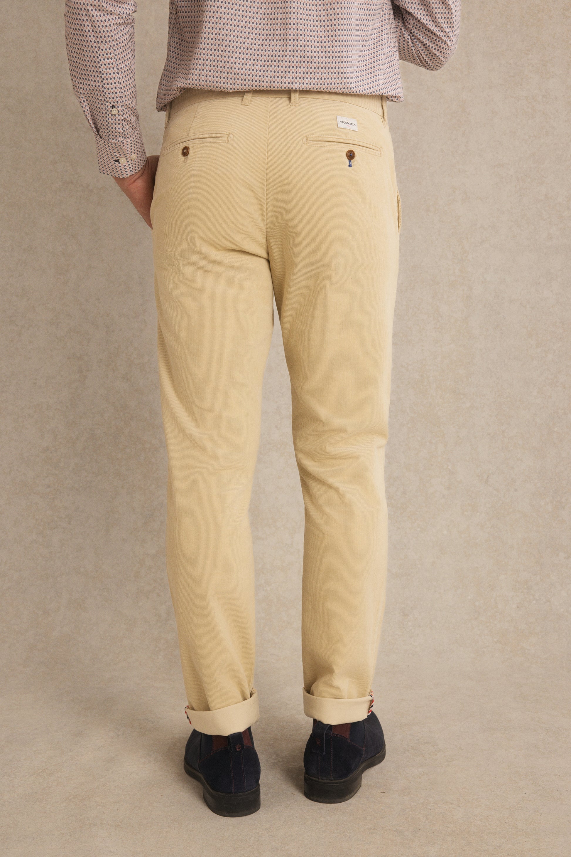 Le pantalon Lorenzo modernise le chino avec l’élégance discrète du velours côtelé.