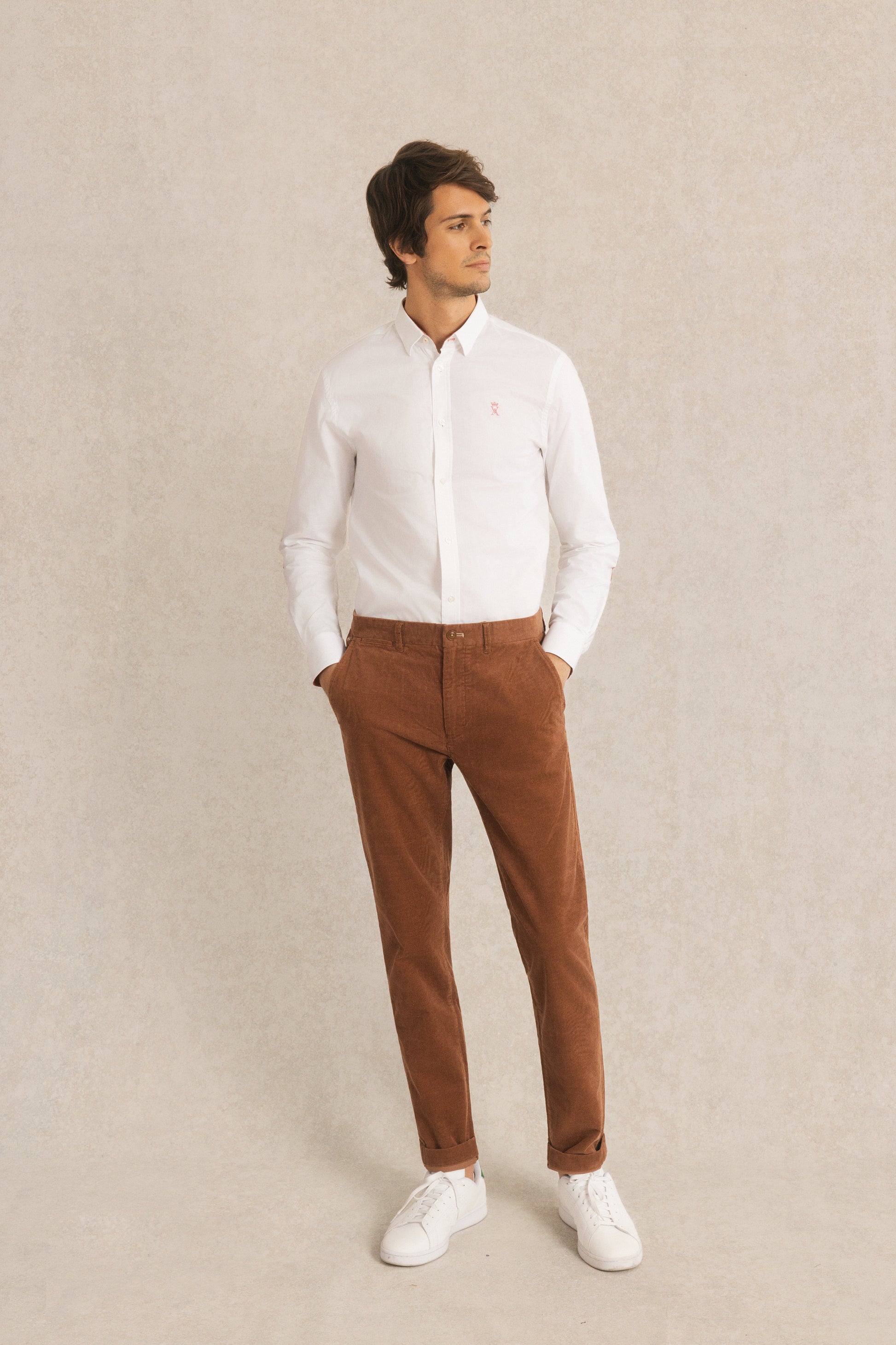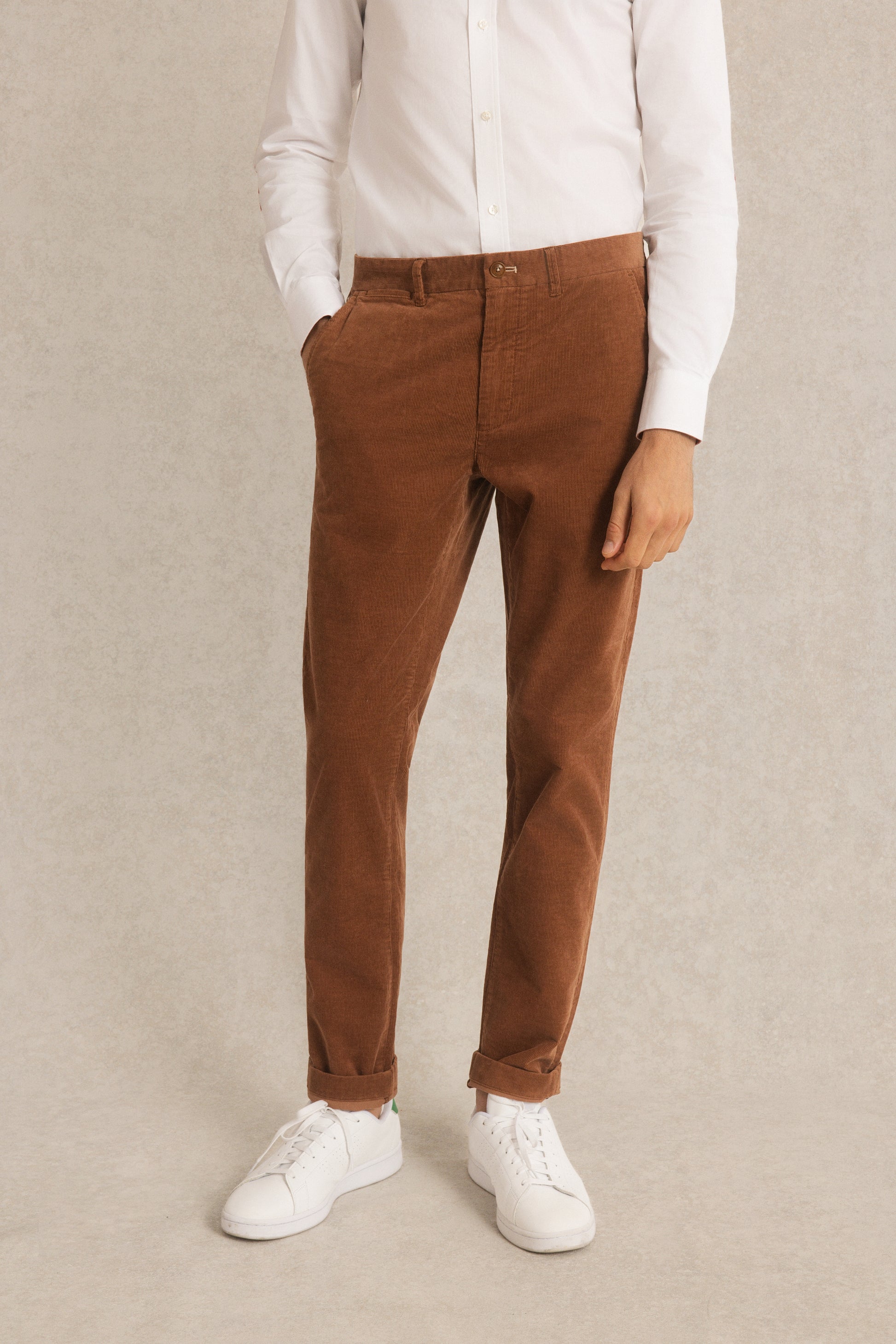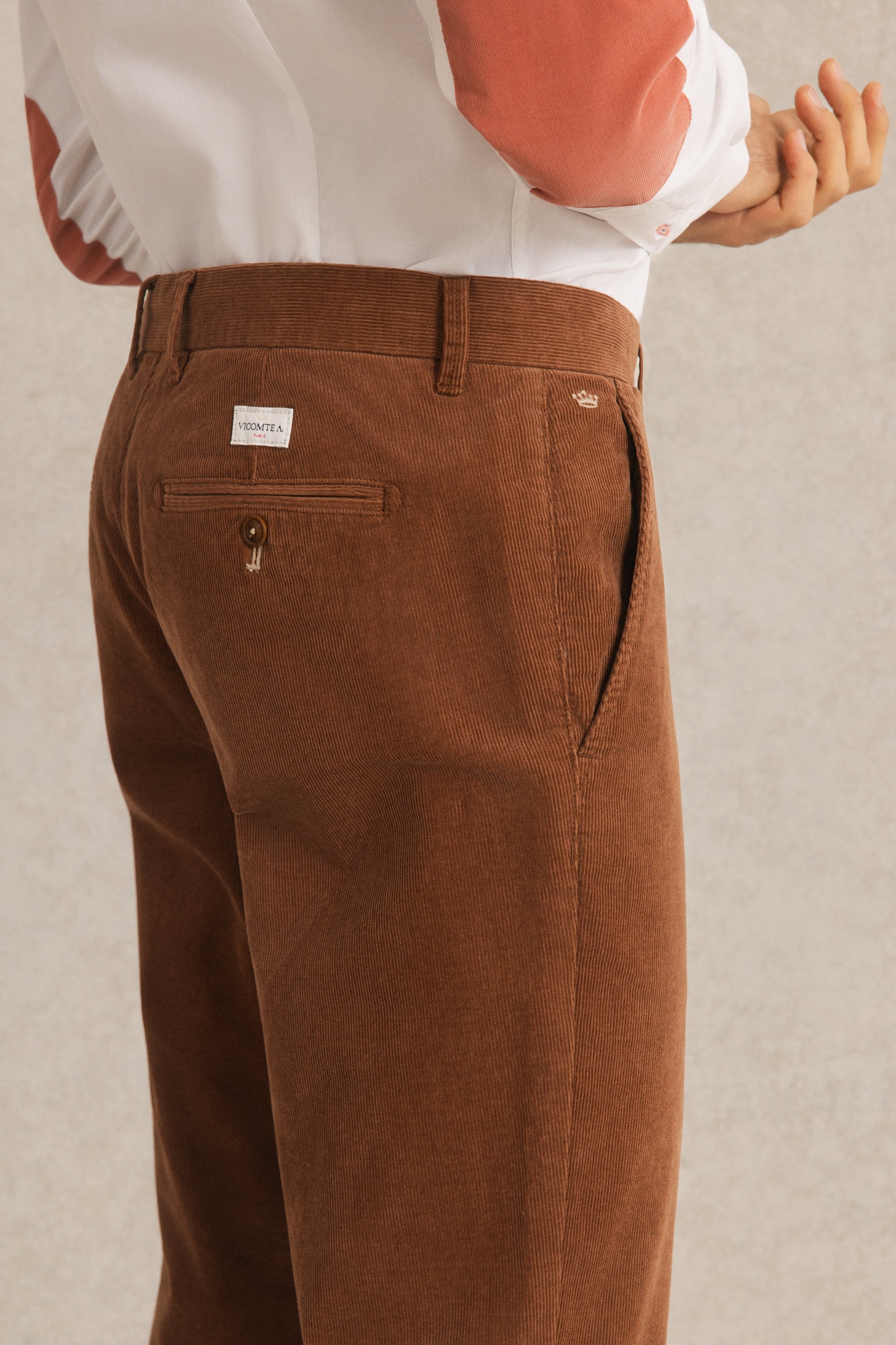 Le pantalon Lorenzo modernise le chino avec l’élégance discrète du velours côtelé.
