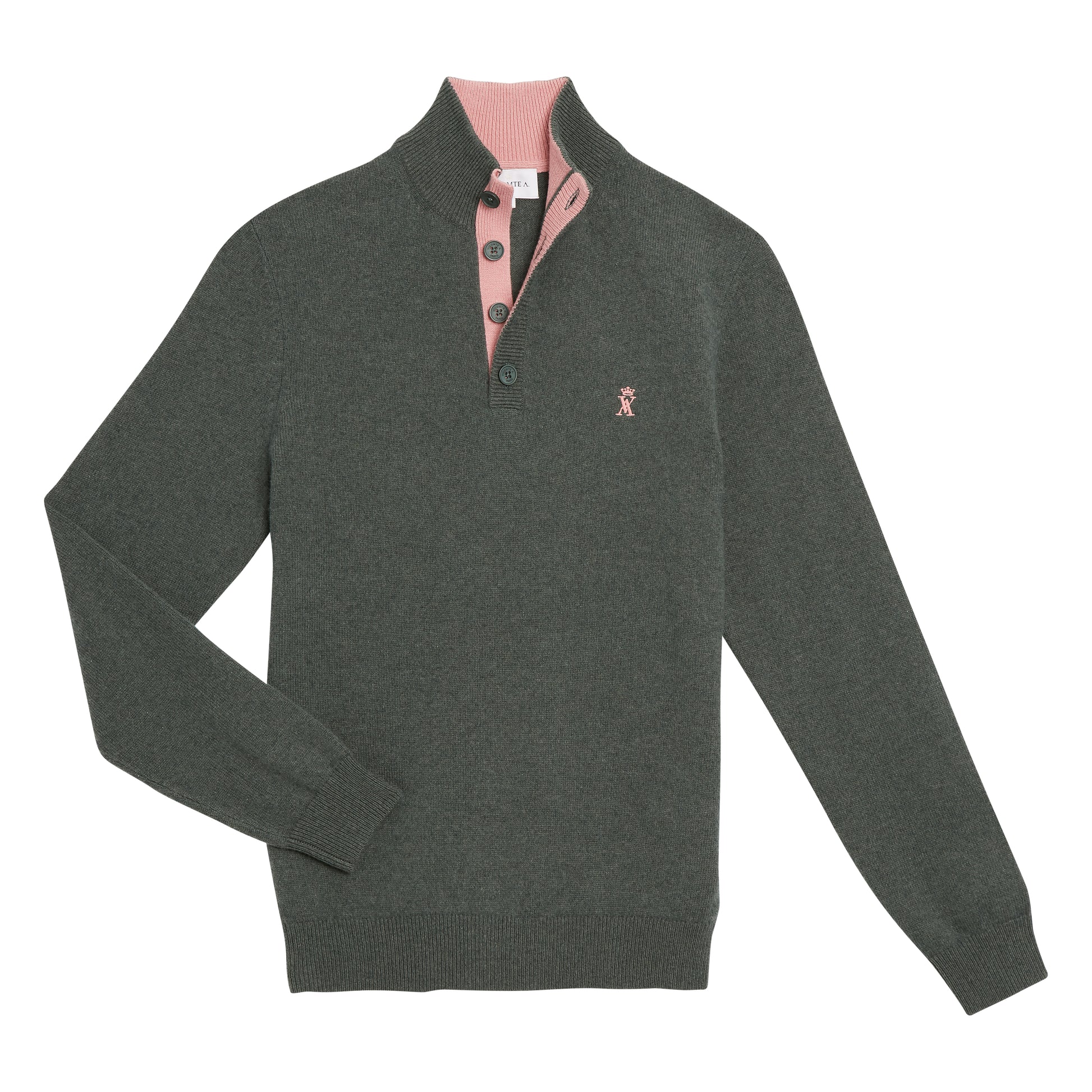 Vicomte A. revisite son iconique pull à col boutonné. Le pull Khemis se présente dans un design classique avec un col haut montant et ses boutons qui lui confèrent un style polyvalent. Portez-le comme un col roulé ou ouvert en col V par-dessus une chemise.