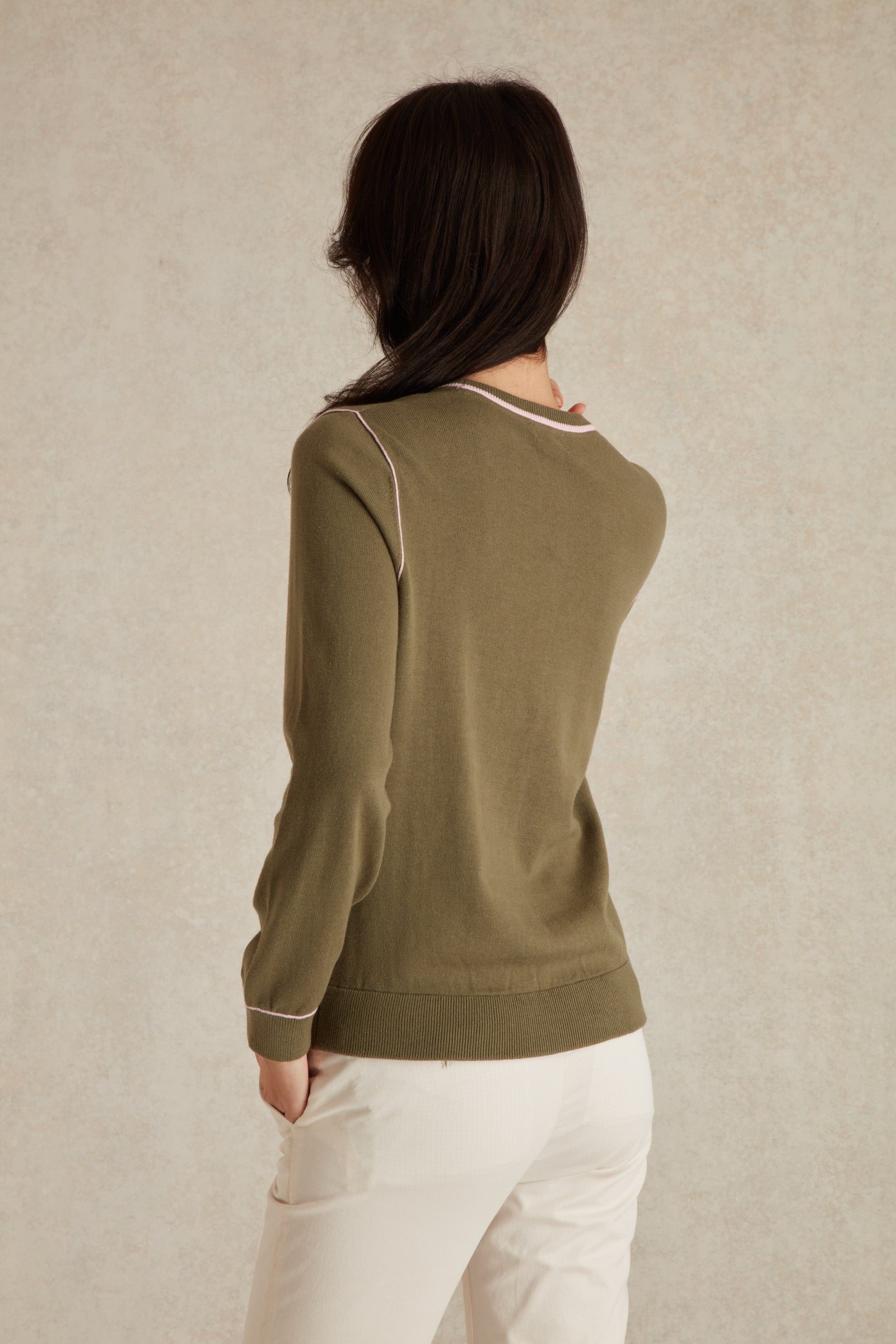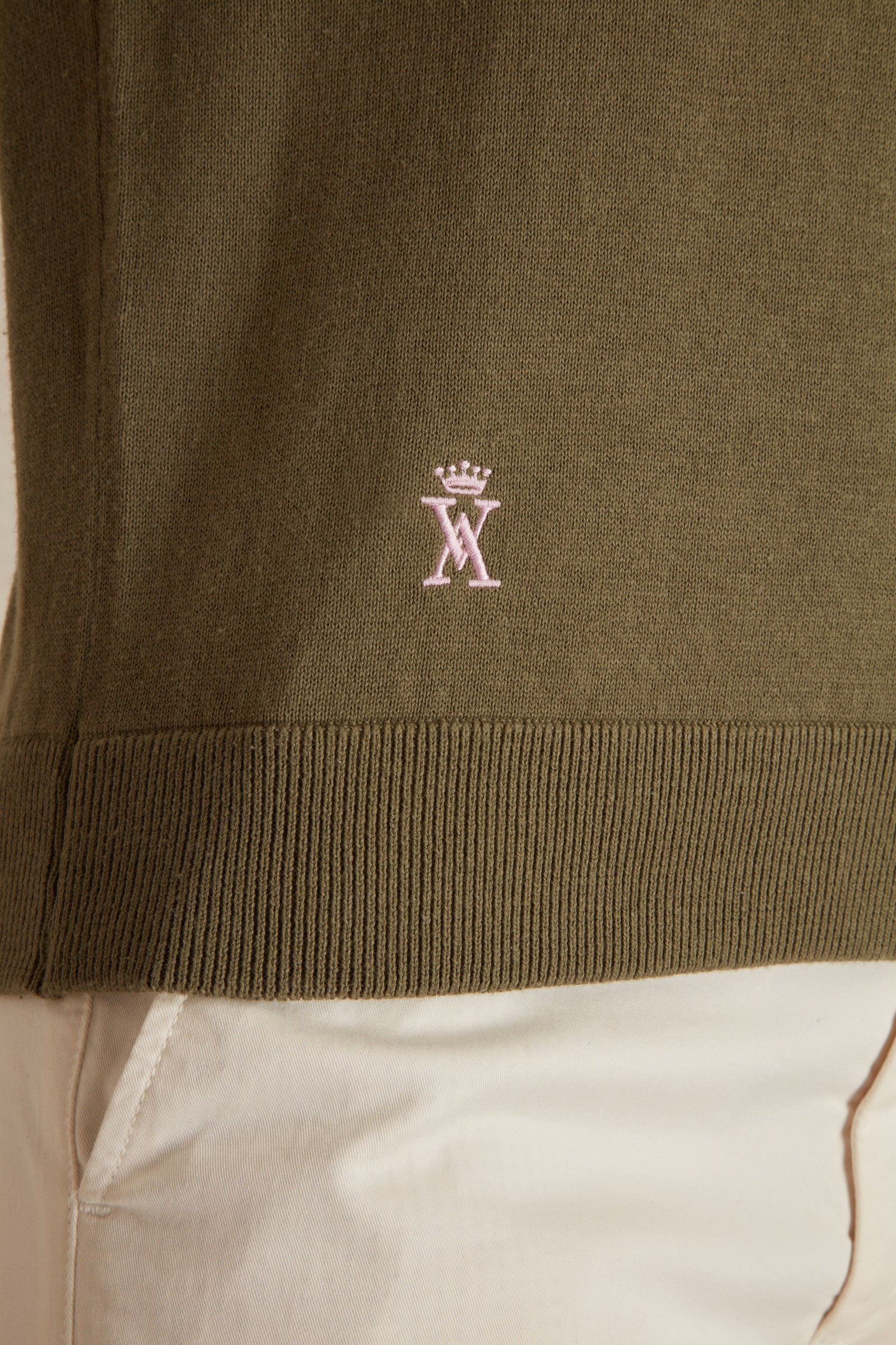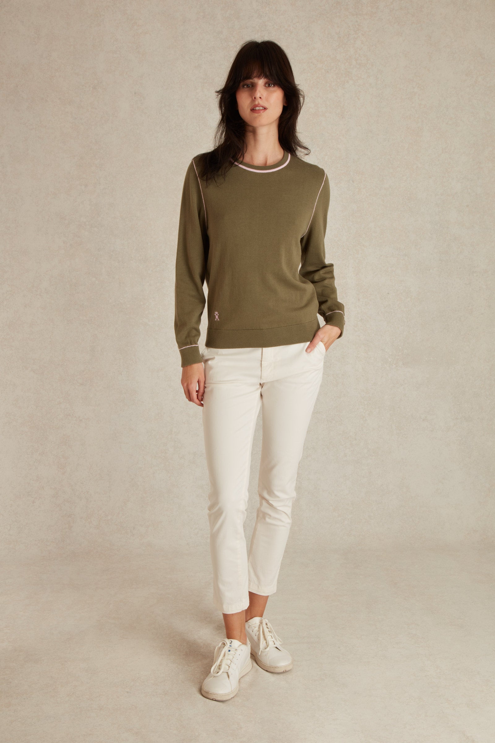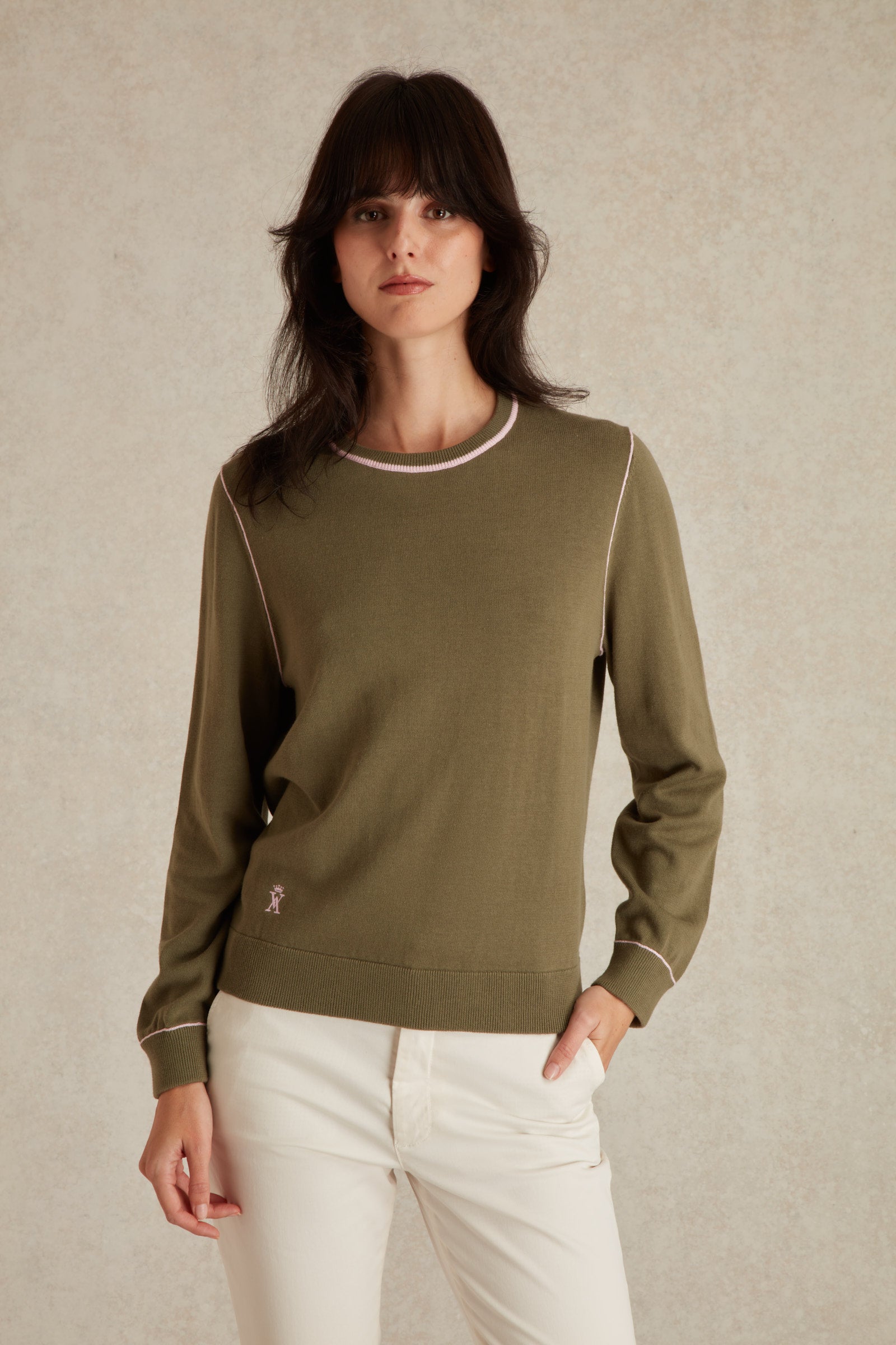 Ses liserés contrastants au col rond, aux épaules et aux poignets apportent une touche de sophistication subtile, tandis que les bords de manches et l’ourlet côtelés assurent une tenue parfaite. En bas à droite, juste au-dessus de l'ourlet, le logo brodé Vicomte A. signe cette pièce avec distinction.