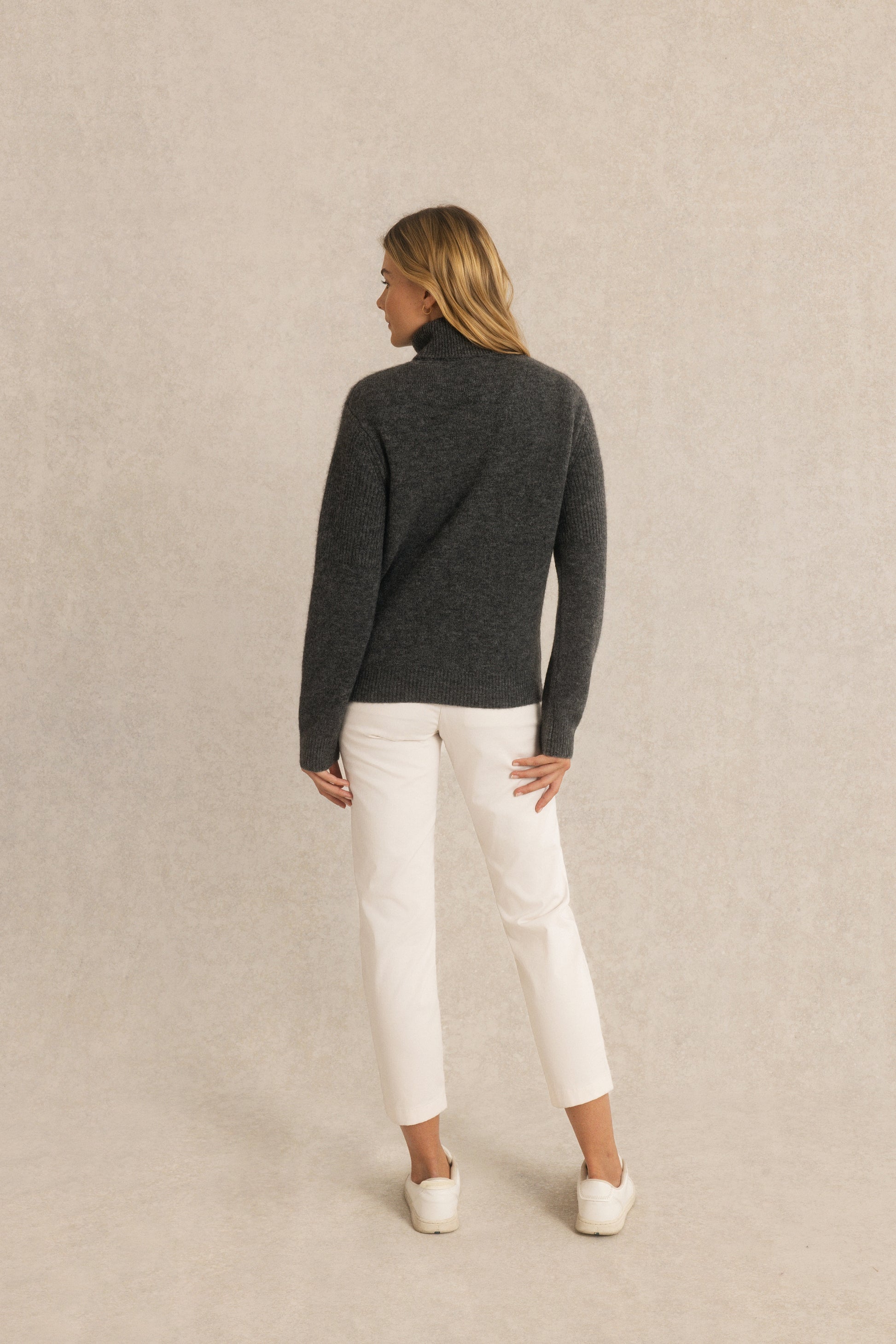Tricoté dans un mélange d’alpaga et de laine, il enveloppe le corps sans alourdir la silhouette.