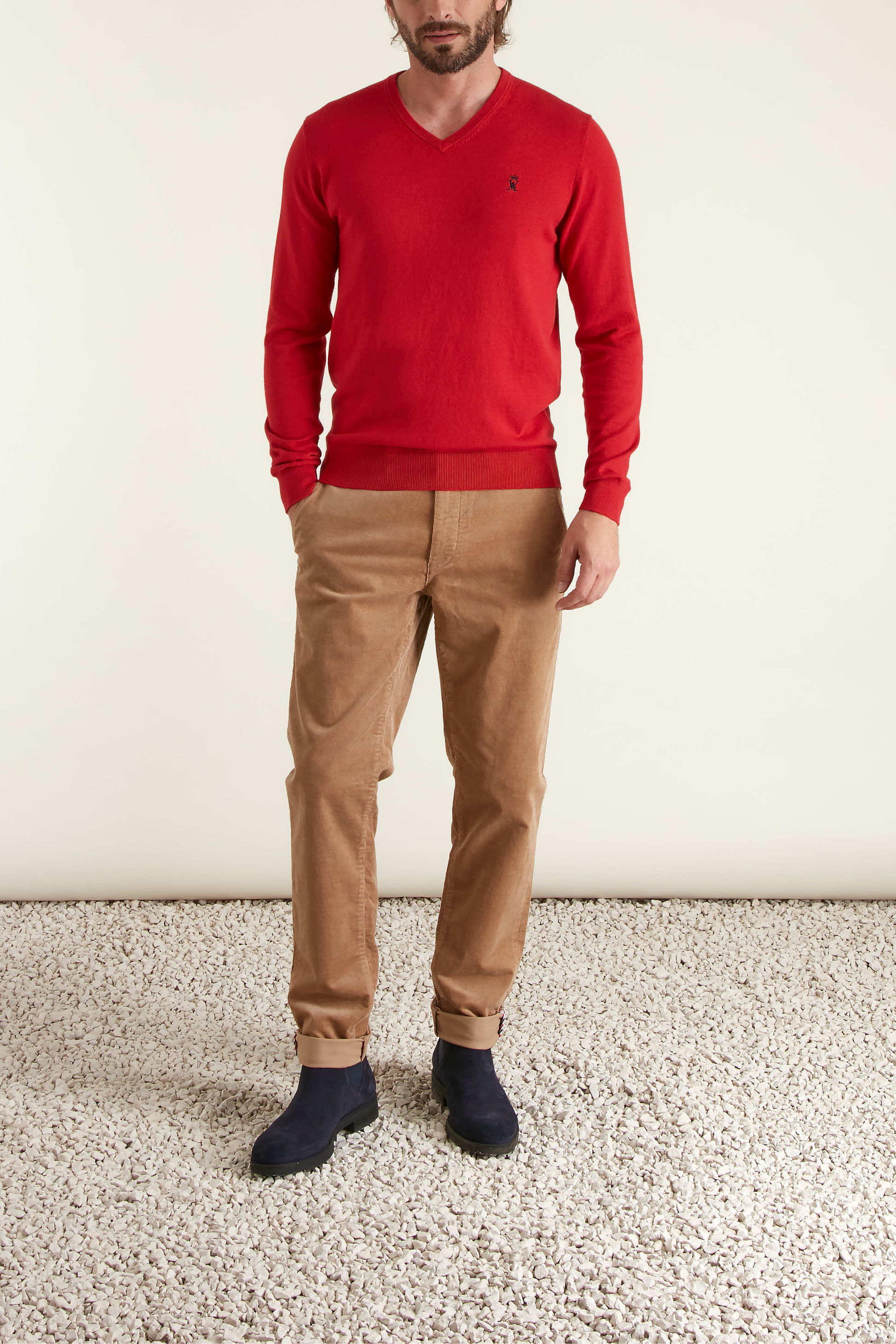 Parfait avec un chino gris clair ou un jean blanc, ce pull rouge apporte cette touche de caractère qui distingue. Une couleur signature pour exprimer sa différence avec raffinement. Pull en coton cachemire Col V Logo Vicomte A. brodé sur la poitrine Coupe normale
