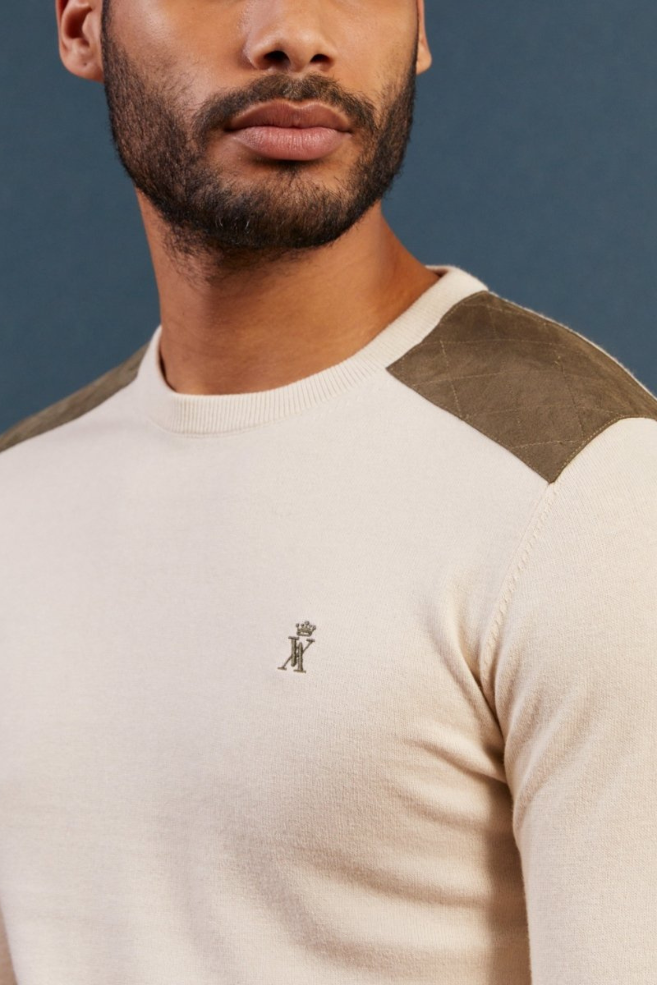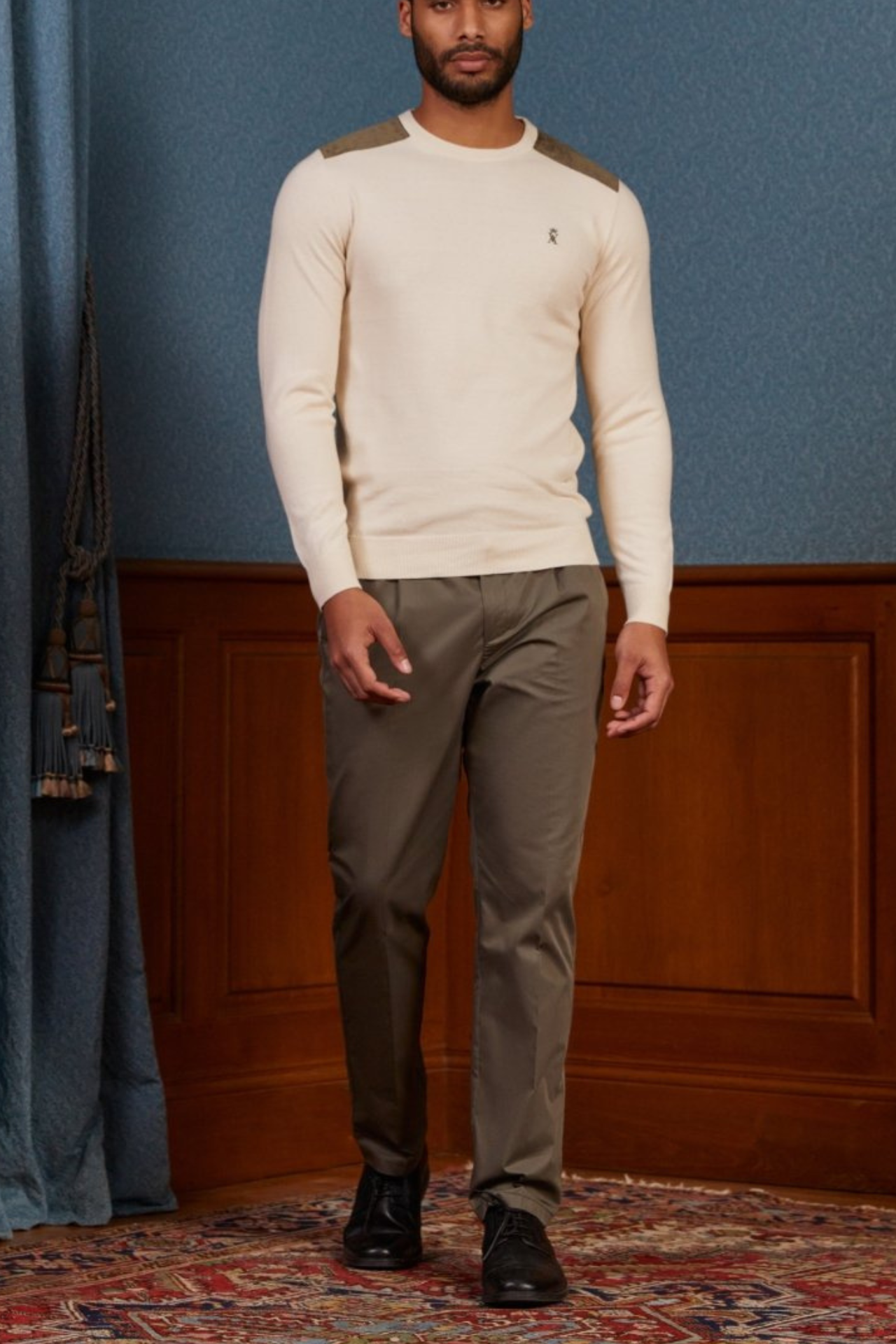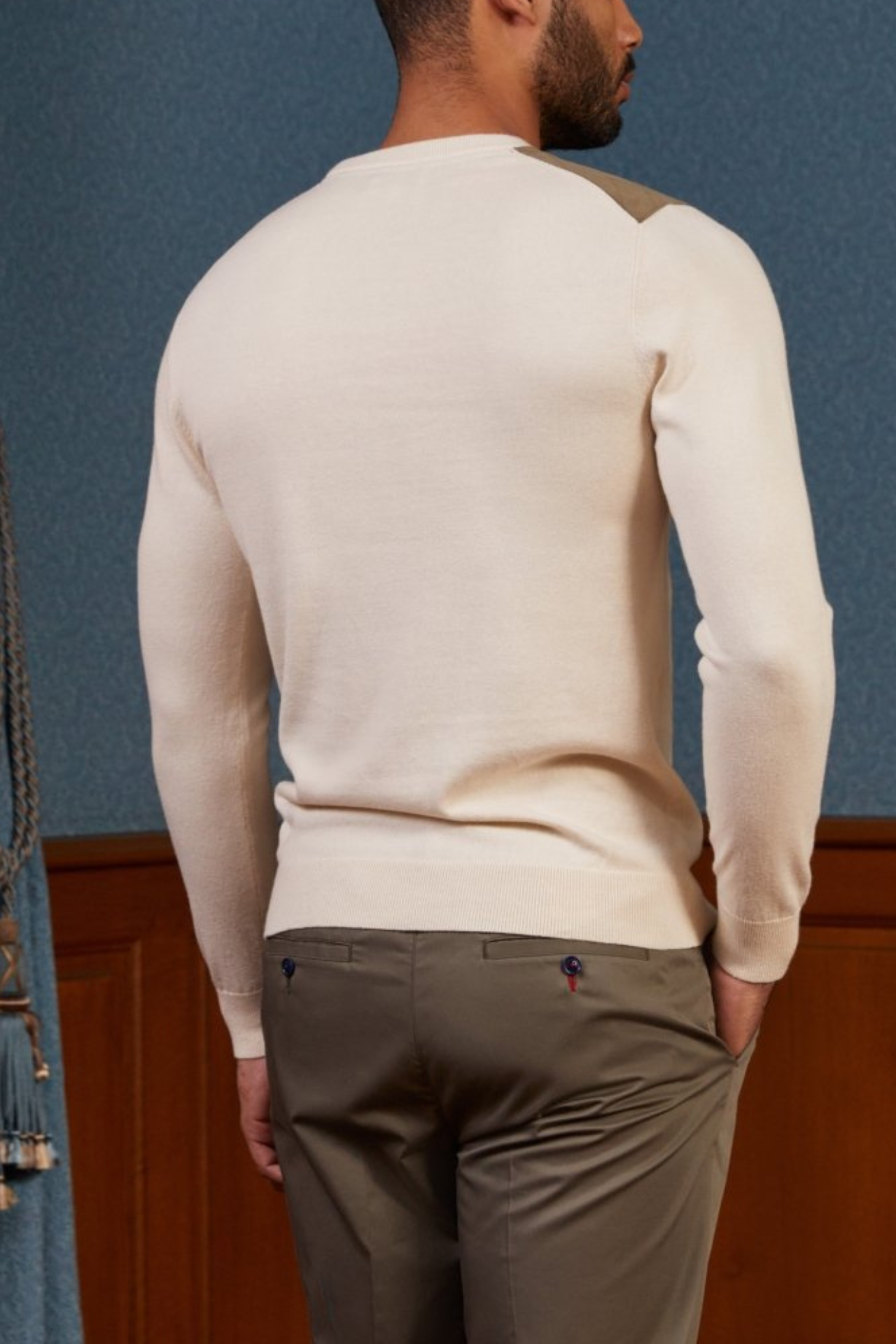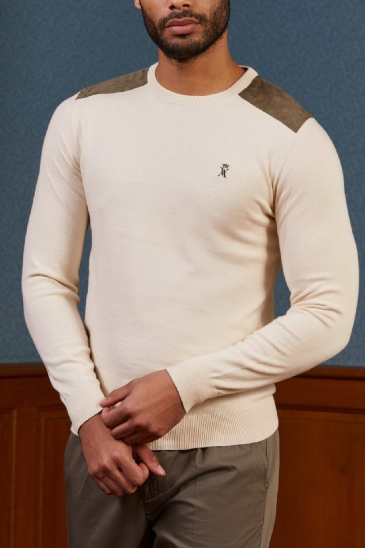 Vicomte A. vous présente l'incontournable pull col rond confectionné dans un élégant mélange coton cachemire. Le détail des épaules contrastées en suédine rajoutera une touche d'originalité à votre look.