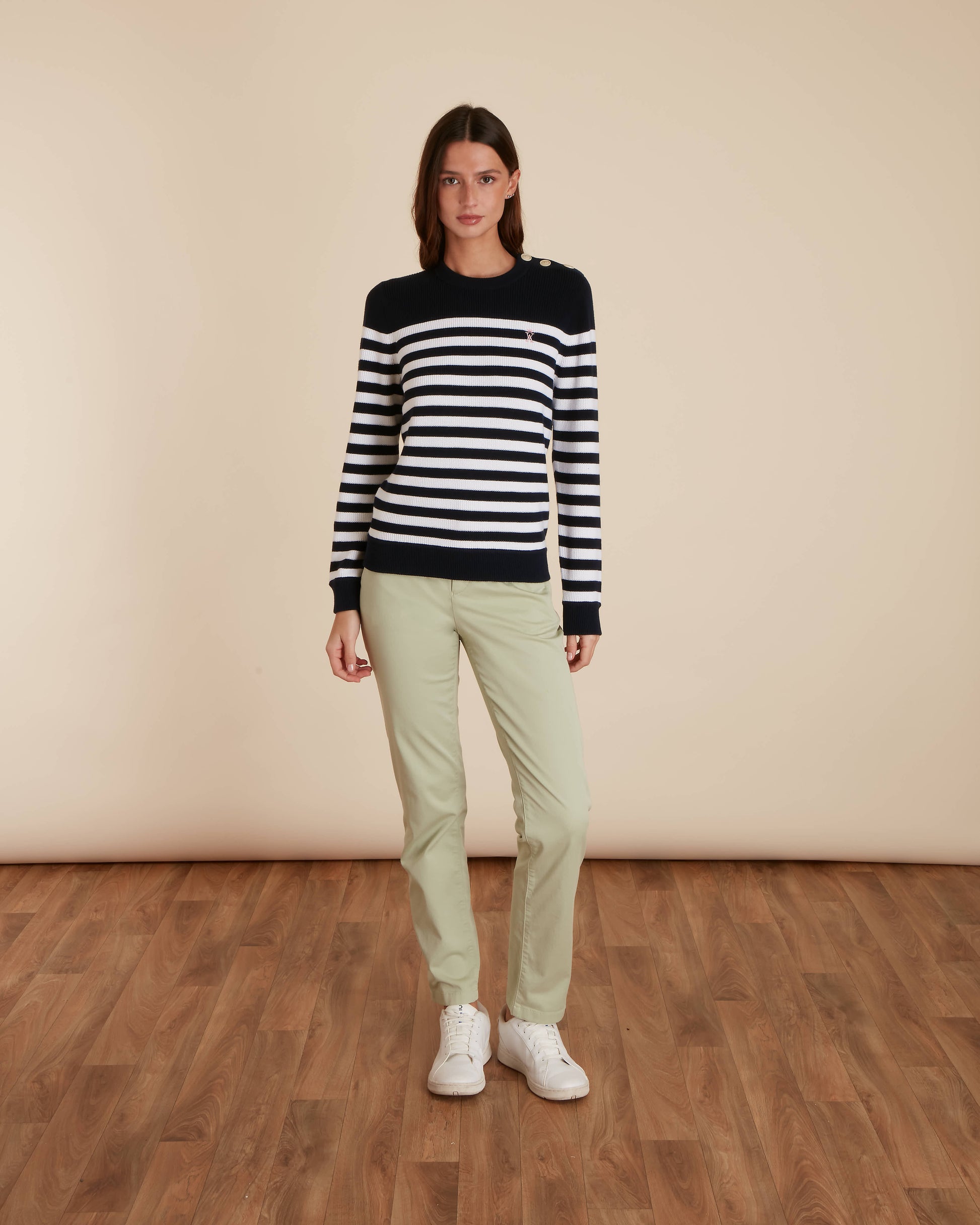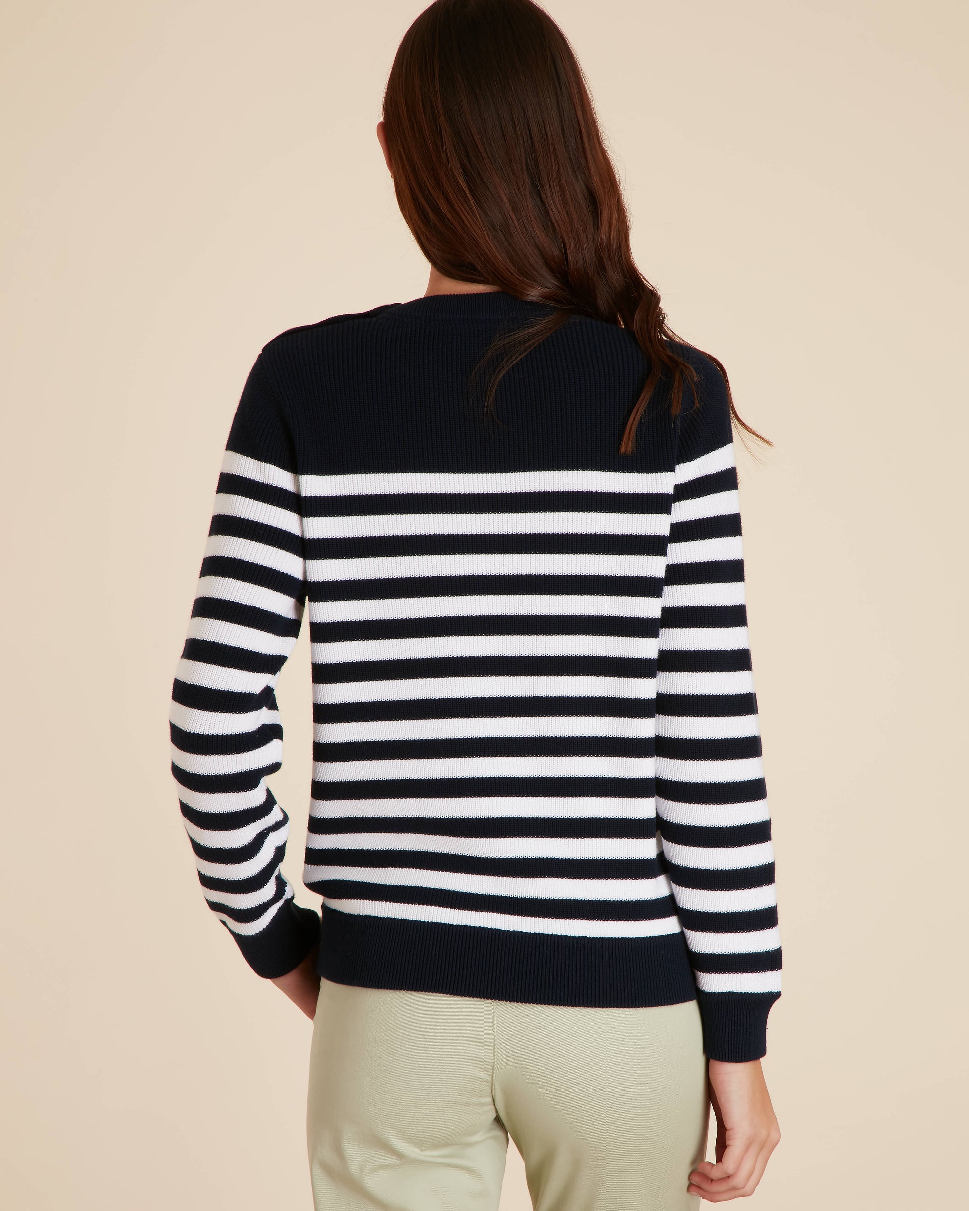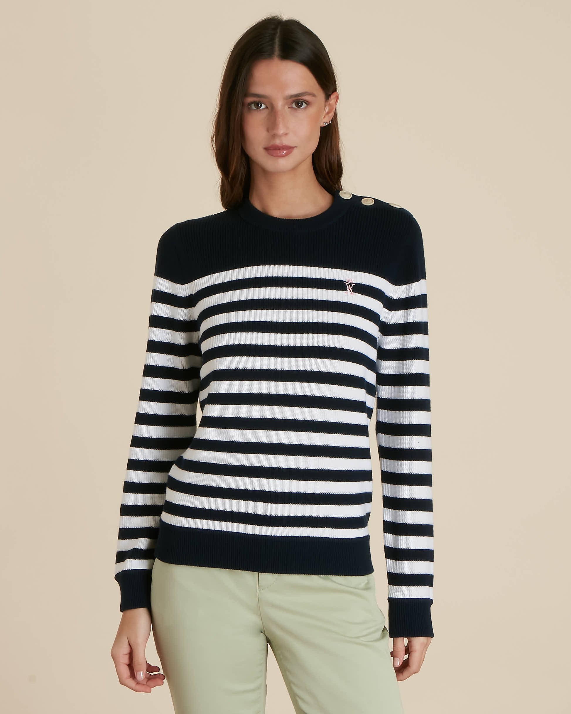 Pour une touche de style intemporel cet été, faites le choix du pull Krys de Vicomte A., arborant fièrement les emblématiques rayures marinières. En optant pour ce pull, vous adoptez un look à la fois classique et moderne qui ne manquera pas de faire sensation.