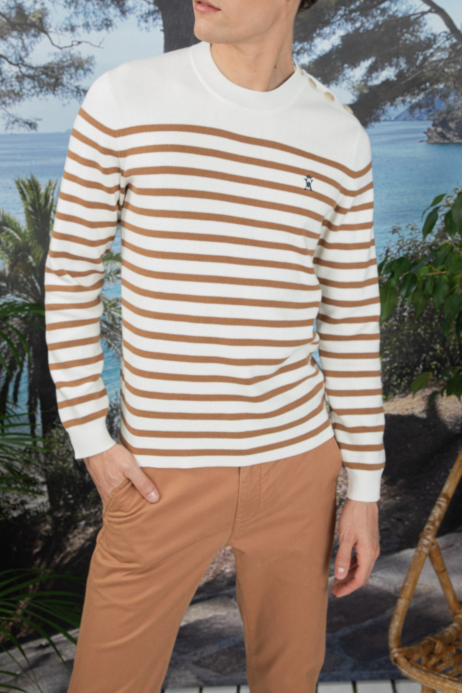 L'iconique pull marinière a est revisité avec des détails élégants à la Vicomte A. Fermeture boutonnée à l'épaule, rayures contrastantes pour rappeler le style marin, le pull KEN signé Vicomte A. est une pièce intemporelle qui se porte en toute occasion.