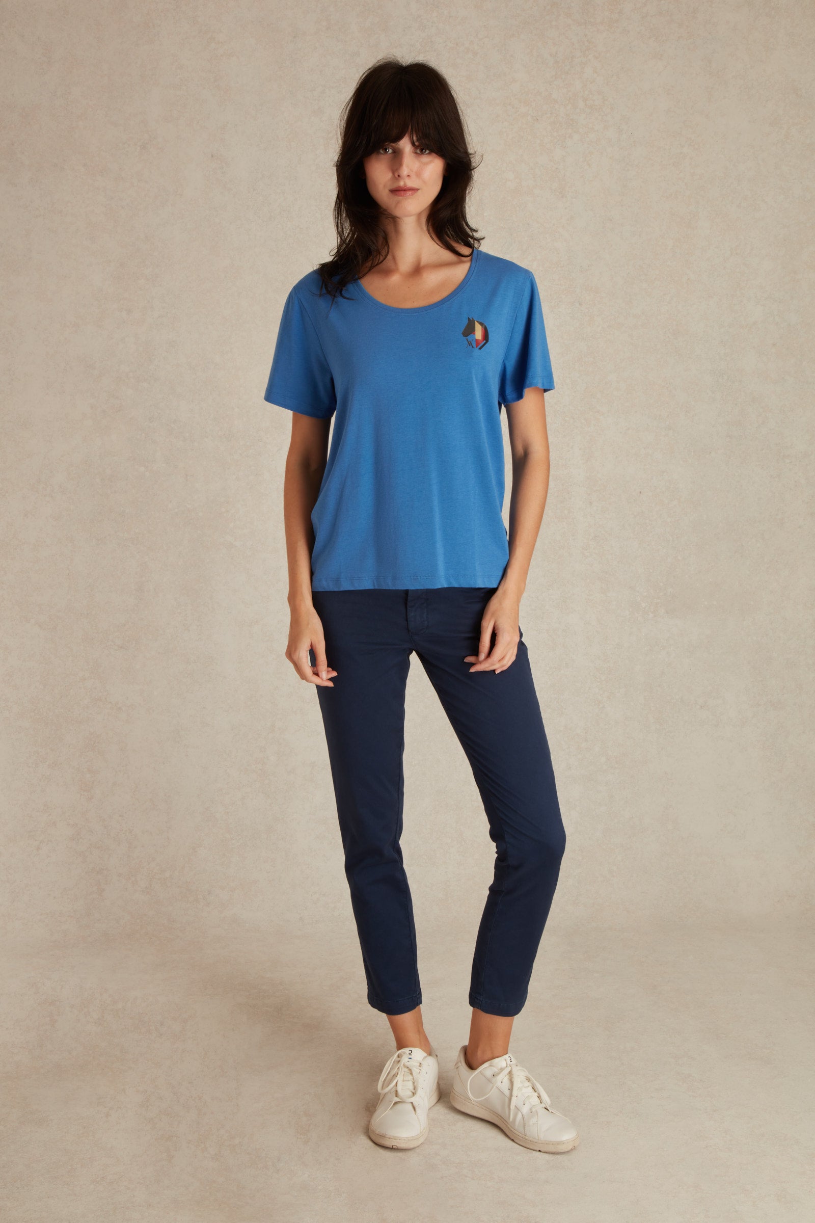 Le T-shirt Toupet incarne une élégance décontractée, portée par la douceur et la souplesse d’un jersey haut de gamme. Sa ligne épurée est relevée par des finitions contrastées aux manches et un écusson brodé qui signe son appartenance à l’univers équestre de Vicomte A.