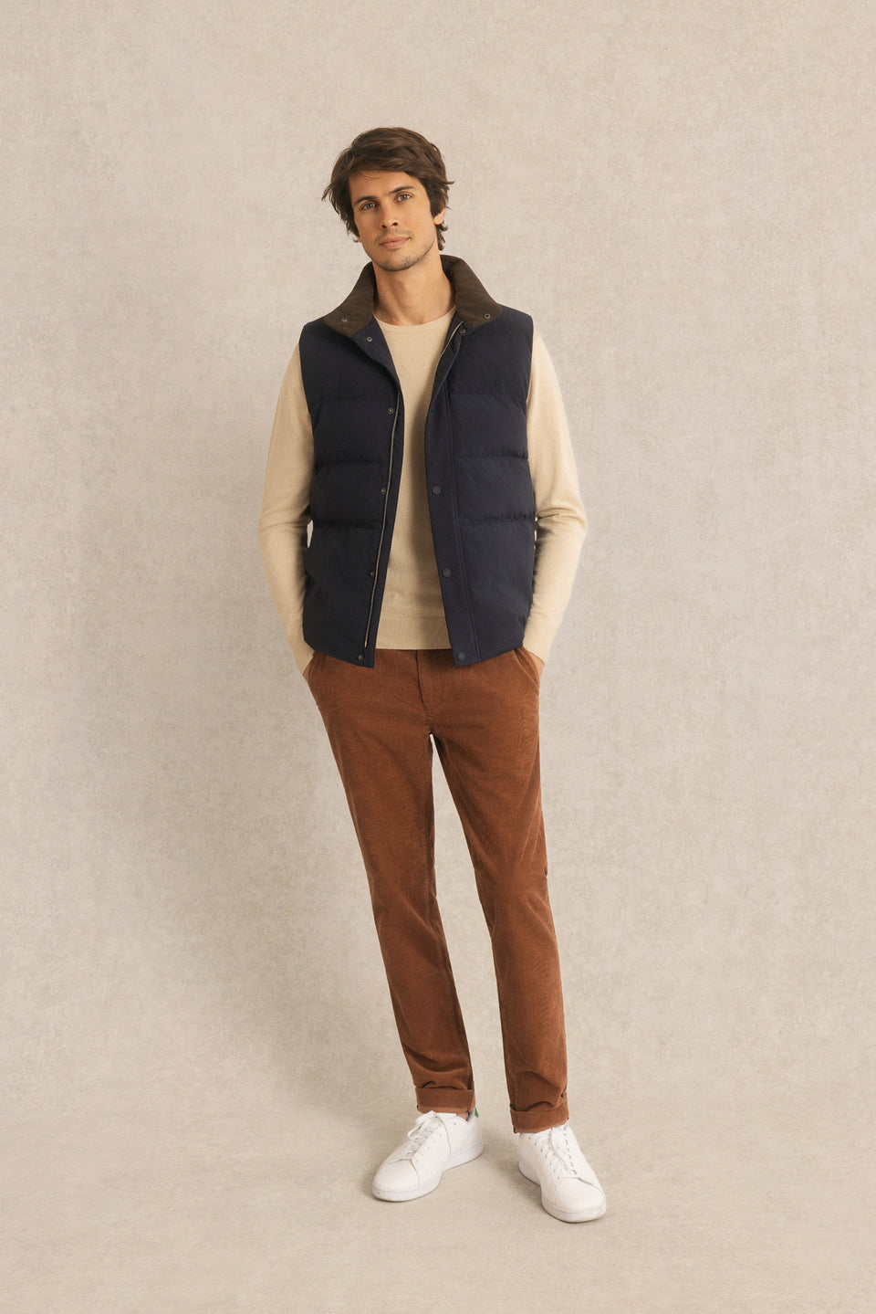 La veste sans manches Octavian se réinvente en bleu marine profond, apportant une touche résolument moderne à vos superpositions. Son fermeture zippée dissimulée, surmontée d’une patte boutonnée, garantit une allure épurée et protégée des courants d’air. Deux poches latérales discrètes conjuguent praticité et sobriété pour accueillir vos indispensables du quotidien.