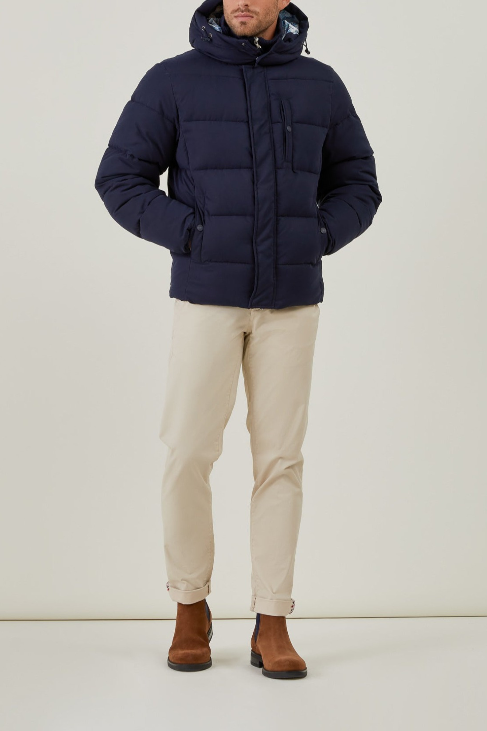 1 poche passepoilée avec bouton sur la poitrine et Deux poches passepoilées avec bouton sur les côtés